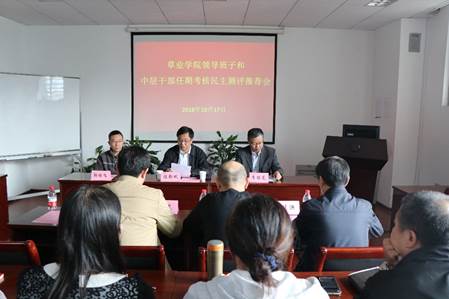 召开领导班子和中层干部任期考核民主测评推荐会,学校任期考核工作小组第四组组长、园艺学院党委书记陈劲枫,考核工作小组成员、学校党委宣传部副部长石松,考核工作小组成员、食品科技学院党委副书记丁广龙,考核小组联络员、学校监察处秘书章法洪等到会指导工作。学院党总支书记李俊龙,院长郭振飞,院党总支副书记、副院长高务龙,副院长徐彬,全体教职员工参加了此次大会。会议由李俊龙主持。