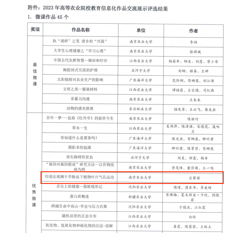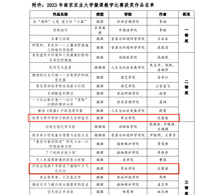 教师庄黎丽的作品《印迹法观测干旱胁迫下植物叶片气孔运动》荣获优秀微课奖,迟英俊、徐彬、张敬的作品《火眼金睛辨真身-牧草与草坪草种子的种及品种鉴定》荣获微课优胜奖。