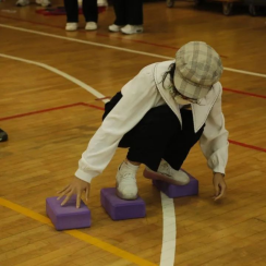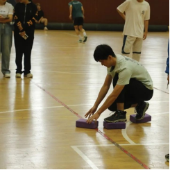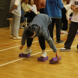 (2)利用三块海绵砖前进,要求不能触碰地面,接触一次地面则在总用时上增加2s;